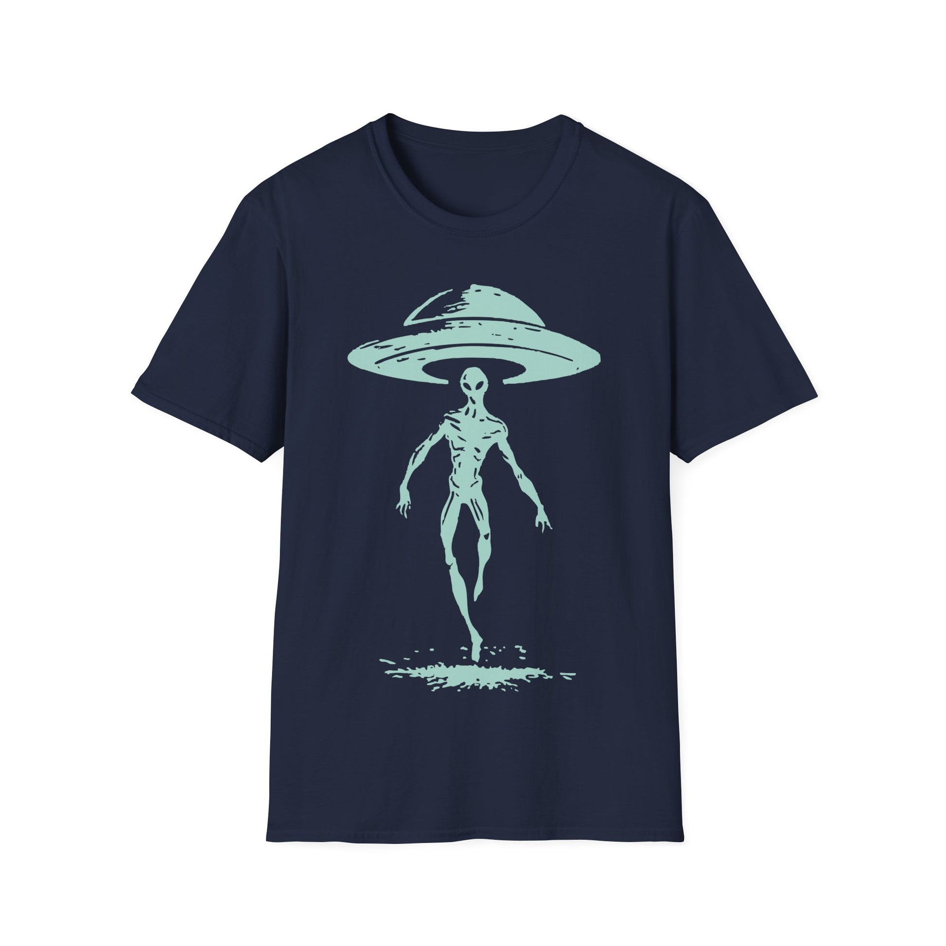 A sleek, hand-drawn visitor steps out of a classic saucer, minimal, high-contrast lines that pop on light tees. Clean, cinematic, and a little ominous, it’s the perfect conversation starter for skywatchers and late-night theorists alike. Soft unisex fit; pairs with denim, flannels, and mysterious plans.