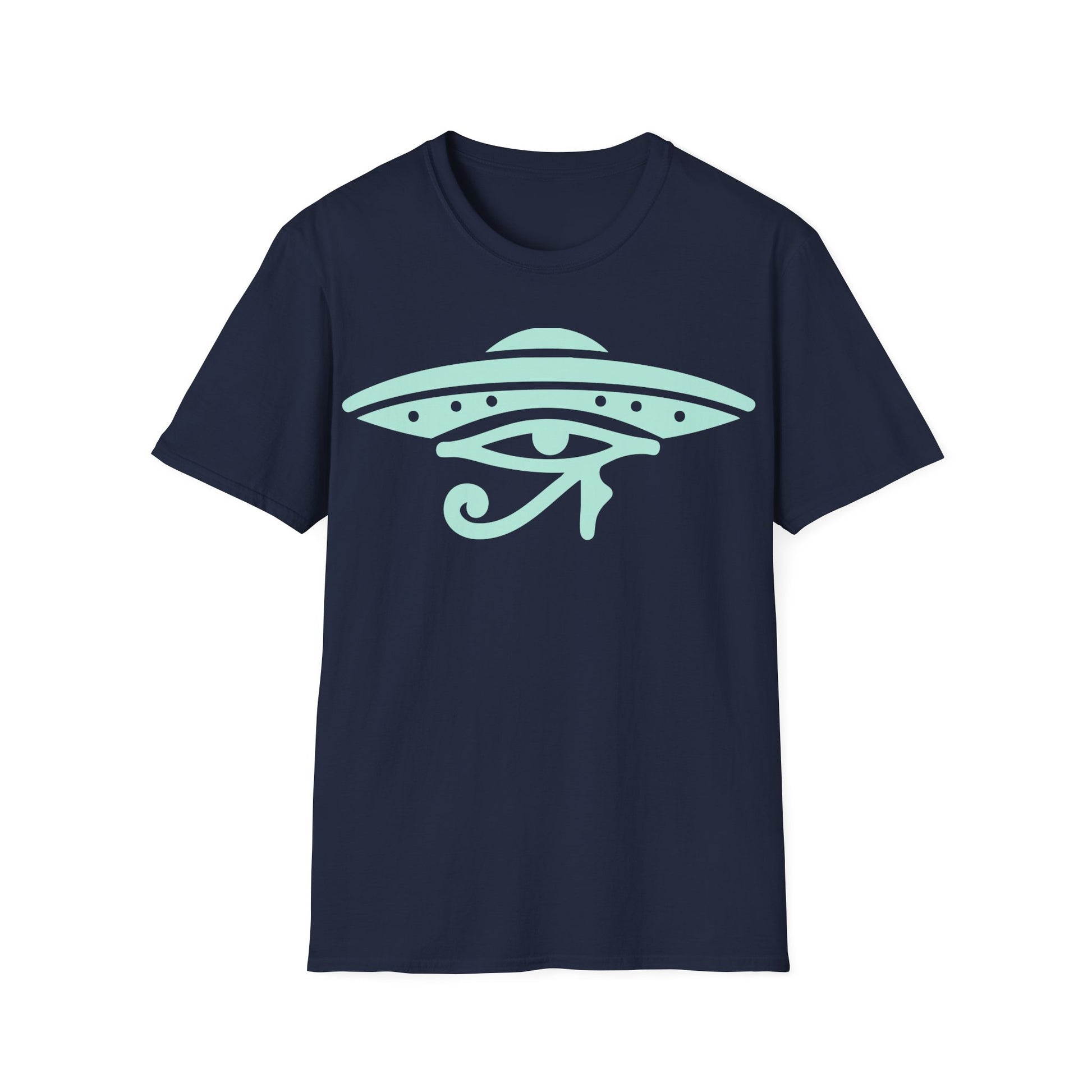 A unique T-shirt featuring a design of a Horus eye in a UFO shape, giving a mysterious and intriguing vibe. Perfect for those who are into ancient Egyptian symbolism or UFO enthusiasts. Ideal for casual wear or as a conversation starter at themed parties or events related to ancient history or science fiction.