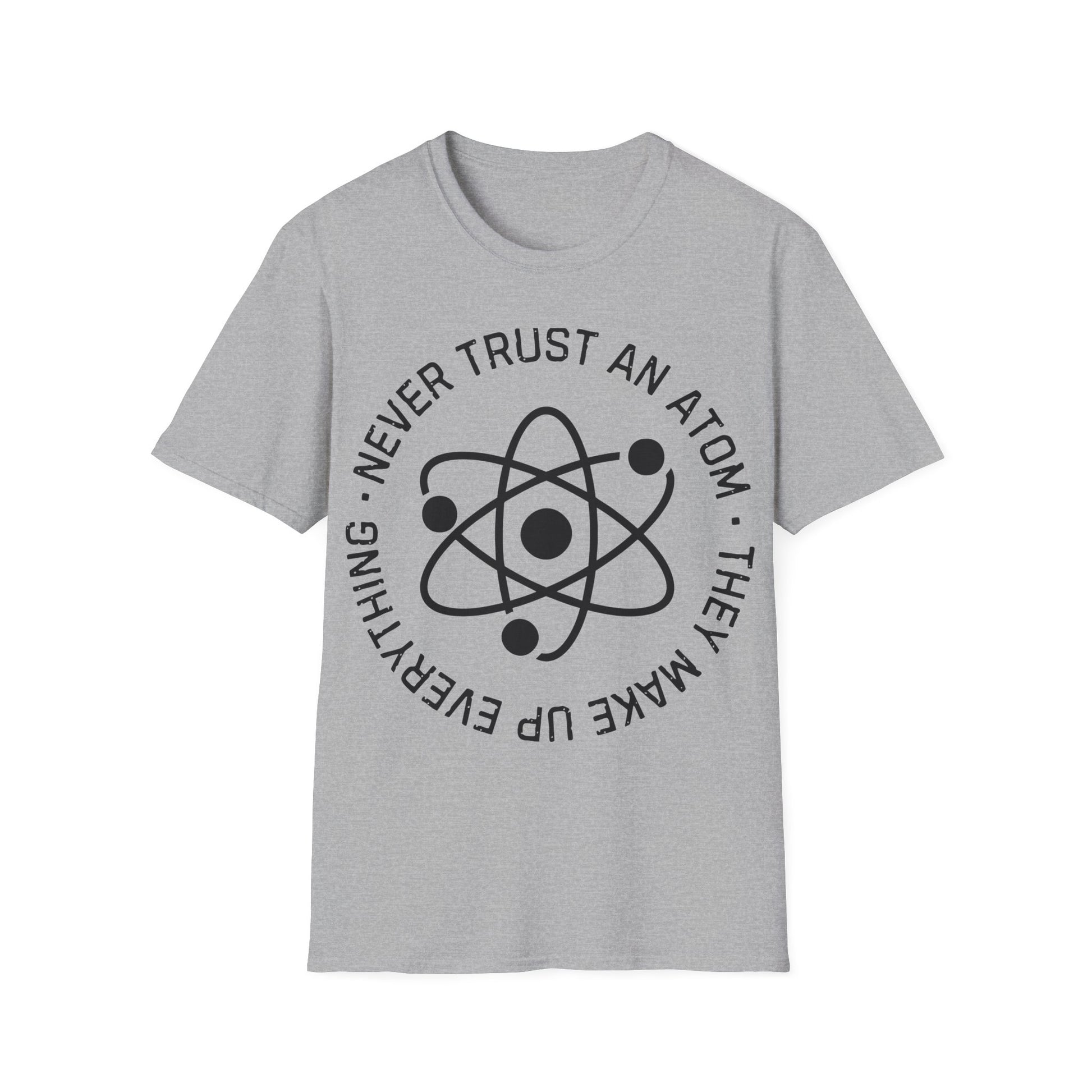 Science joke meets skeptic chic: “Never trust an atom— they make up everything.” Clean, high-contrast print tuned for black tees, perfect for lab nerds, conspiracy debaters, and anyone who likes their truths peer-reviewed with a wink.