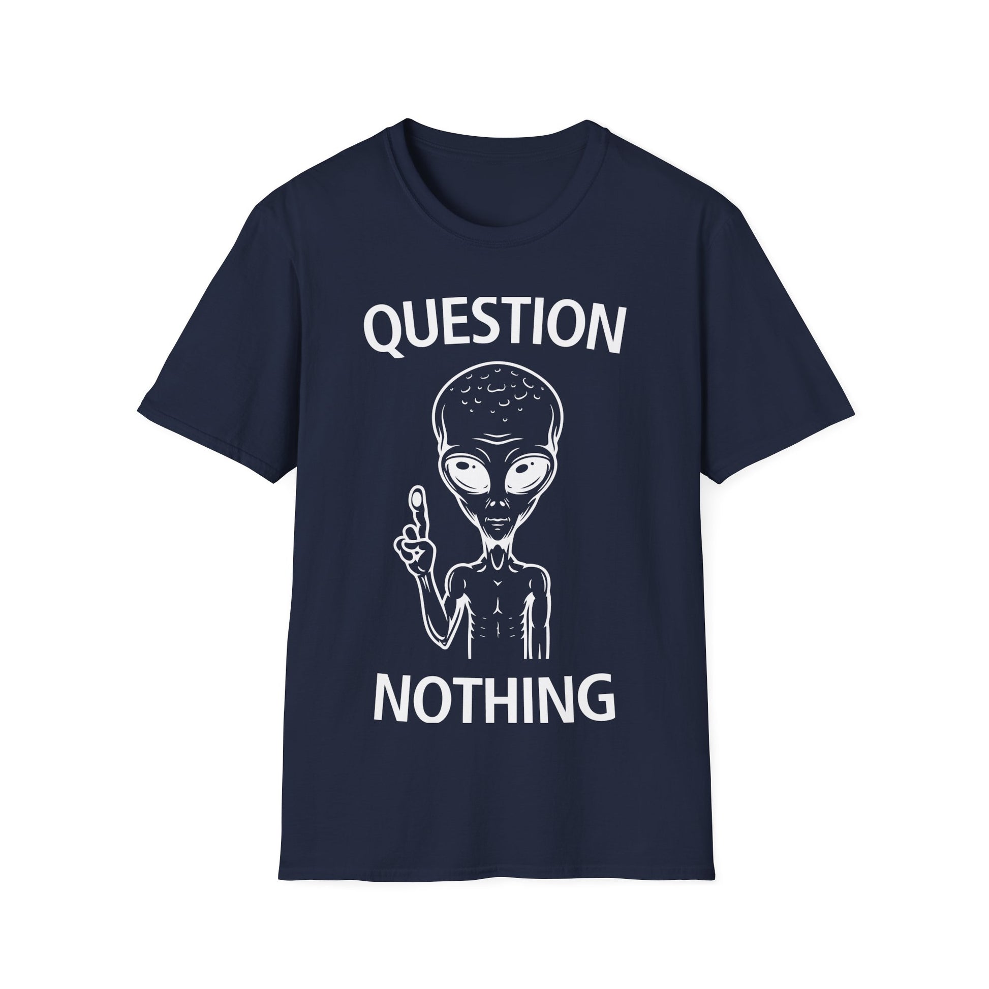 “Question Nothing.” A sharp, ironic command for skeptics who do the opposite. High-contrast typography tuned for dark and light color tees—perfect for media-savvy minds, debate nights, and anyone who treats every headline like a puzzle.