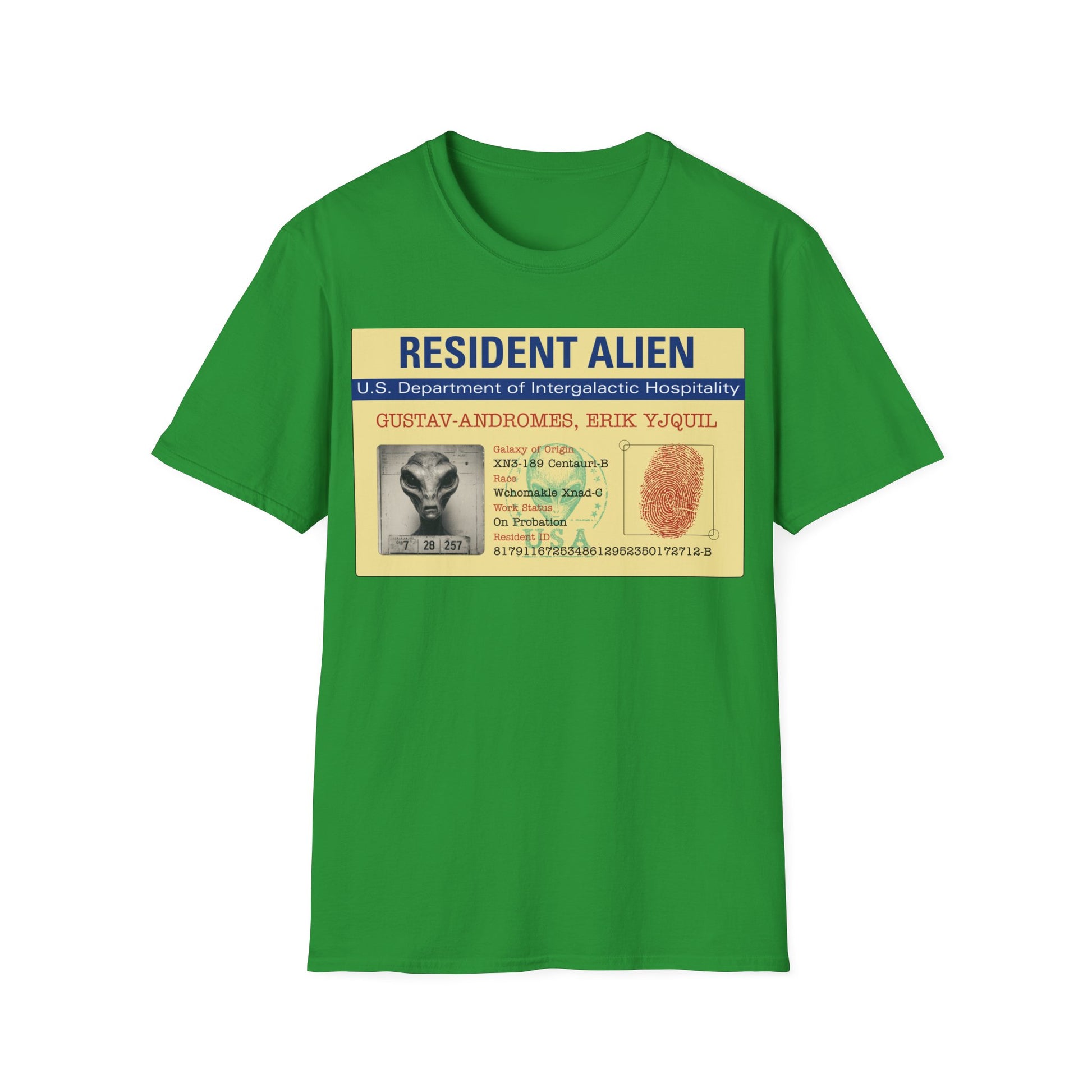 An officially unofficial “Resident Alien” ID—vintage badge styling with alien mugshot, fingerprint, and absurd bureaucratic details from the “Department of Intergalactic Hospitality.” A conspiracy-wink meets retro government chic, perfect for sci-fi fans, paperwork survivors, and anyone still waiting on their green (little) card.