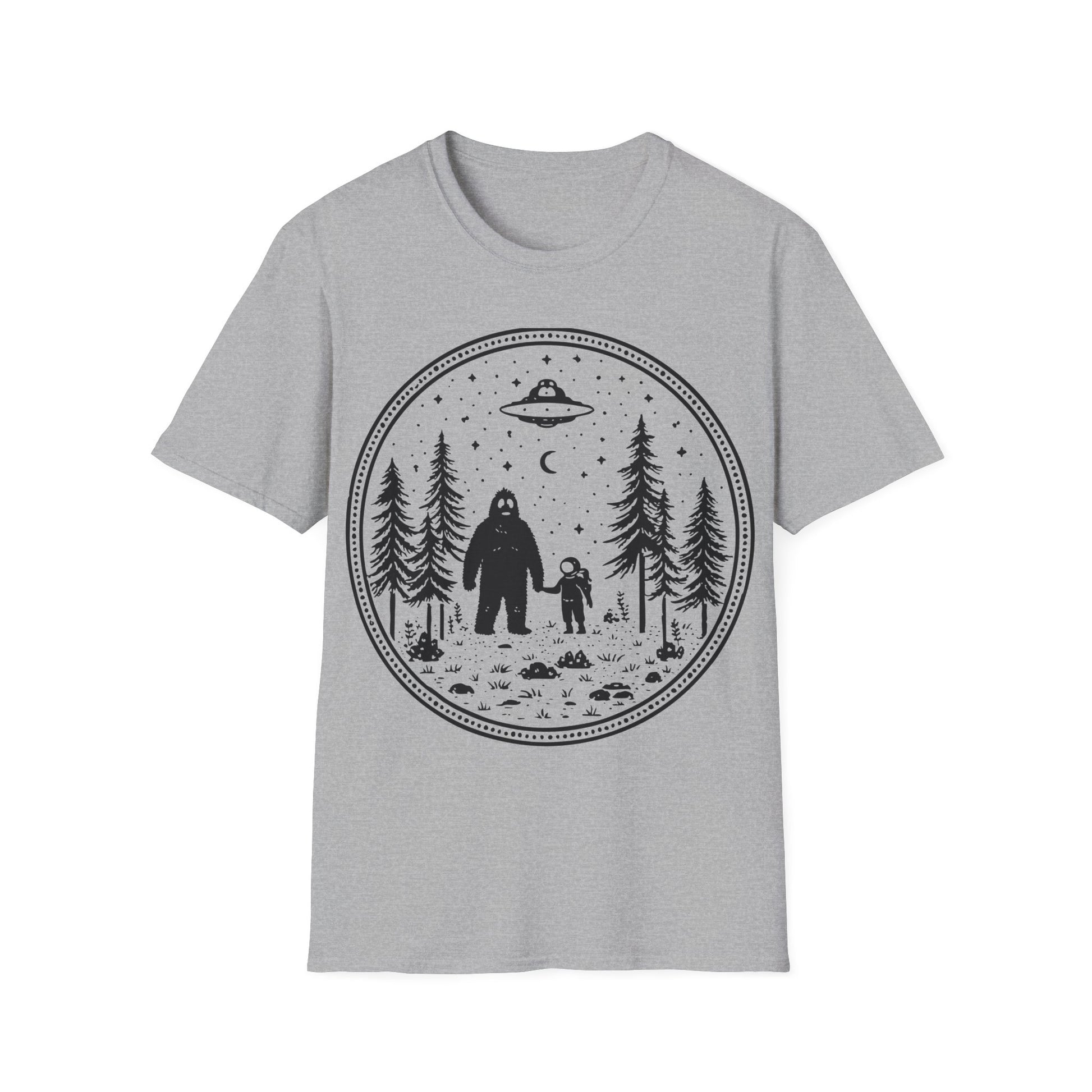 A cosmic souvenir from a weirder roadside gift shop—Sasquatch and a little grey preserved in a swirling snow globe. High-contrast art built for black tees, mixing cozy winter vibes with campfire-story chaos. Perfect for cryptid hikes, UFO meetups, and anyone who collects “evidence” like trinkets.