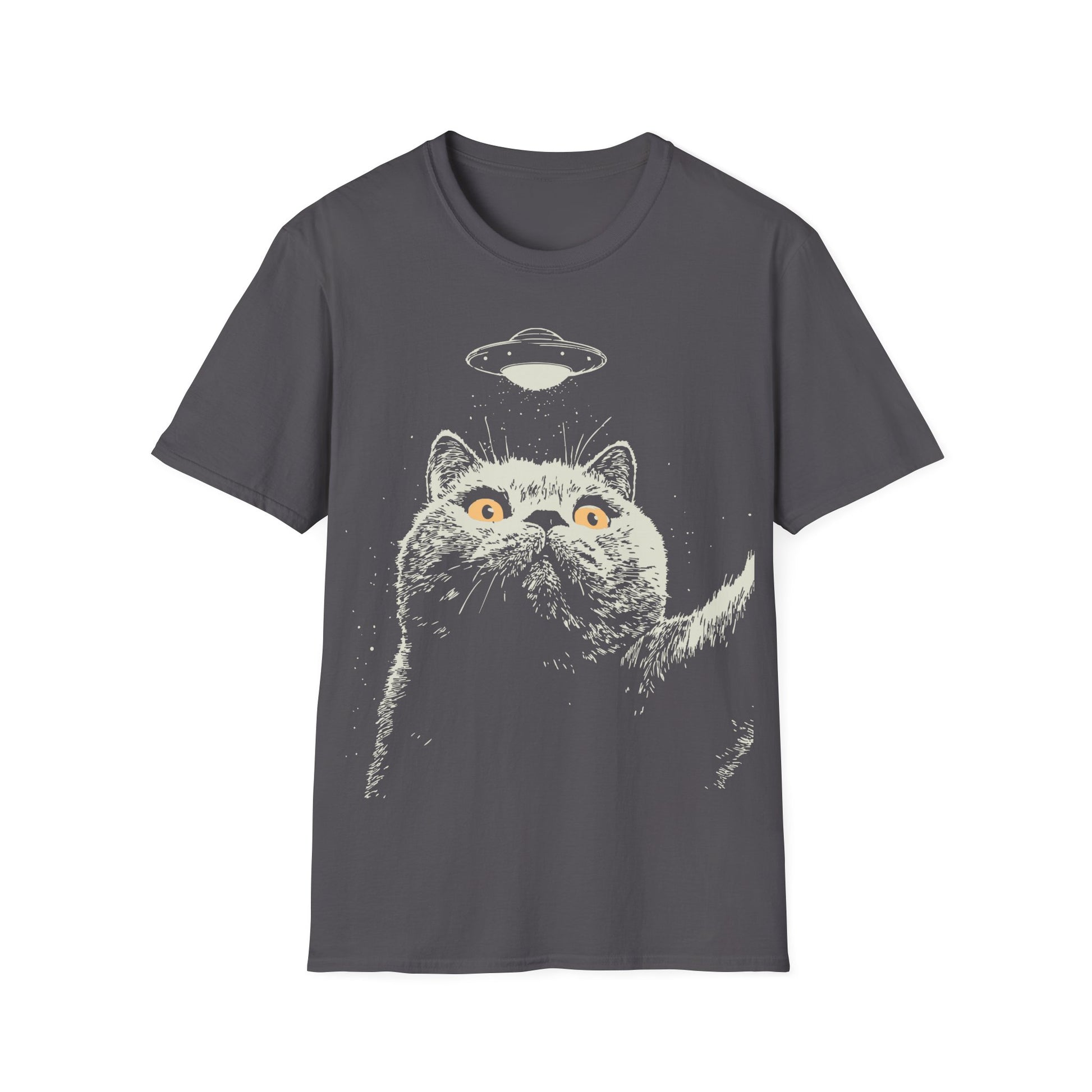 A Scottish Fold mid-selfie with a saucer photobomb—proof the cat camera roll is wilder than ours. Bold, high-contrast lines tuned for dark tees, mixing meme energy with close-encounter vibes. Perfect for night-owl pet parents, UFO fans, and anyone who suspects their cat knows more than they’re letting on.