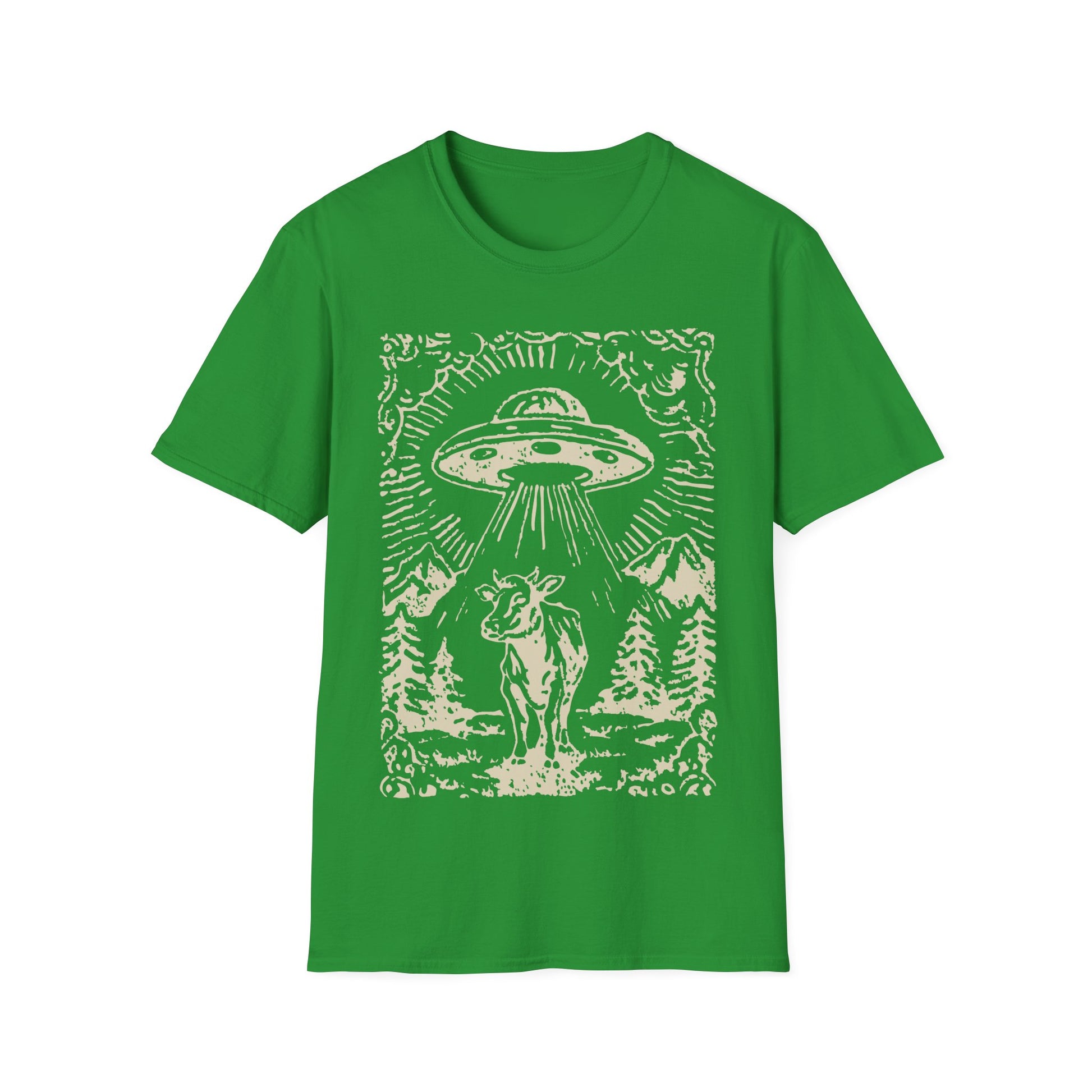 Old-school pulp meets barnyard legend; a woodcut-style saucer casts its beam over a lone cow amid mountains and pines. The cream-on-black ink gives it a rustic poster vibe that pops on dark tees. Perfect for farmers’ market irony, campfire stories, and late-night skywatching. Soft unisex fit; guaranteed double-takes and a few mooooo’s.